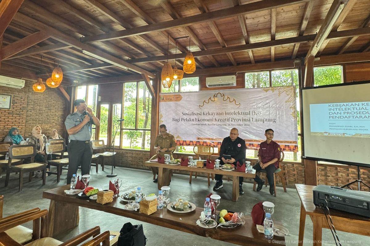 LAMPUNG_INFO - Selasa, 26 November 2024. Bertempat di Lamban Sabah, Penyuluh Hukum Kantor Wilayah Kementerian Hukum dan HAM Lampung; M. Zuhri dan Farid Anfasa melaksanakan kegiatan penyuluhan hukum mengenai Kekayaan Intelektual pendaftaran merek bagi Pelaku Ekonomi Kreatif Provinsi Lampung. Kegiatan ini difasilitasi oleh Dinas Pariwisata dan Ekonomi Kreatif Provinsi Lampung dan dihadiri oleh 75 UMK Binaan.
